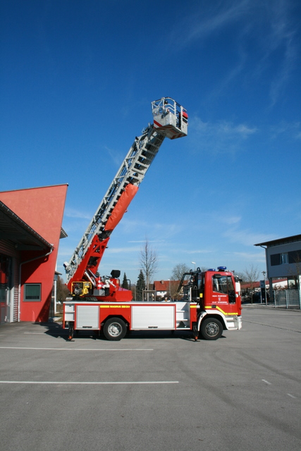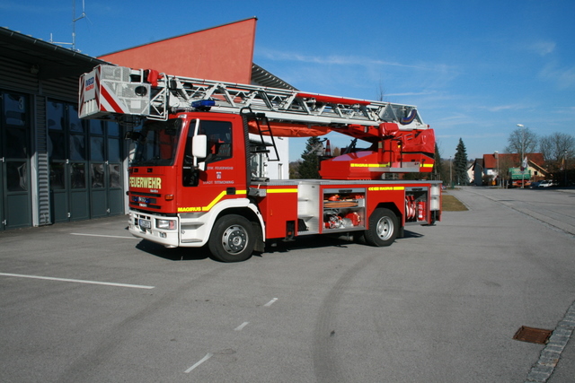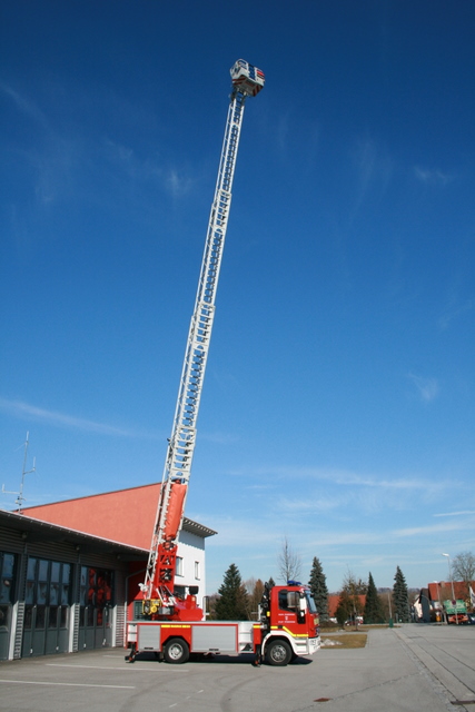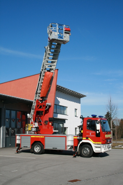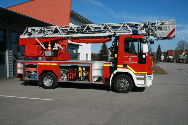Die Drehleiter (DLK) ist das häufigste und bekannteste Hubrettungsfahrzeug der Feuerwehr. Die DLK 18 / 12 der Feuerwehr Tittmoning verfügt über einen Rettungskorb, der mit dem so gennanten Leiterpark fest montiert ist. Die Drehleiter hat eine Nennrettungshöhe von 18 Metern, das entspricht ungefähr der Höhe des 4. Obergeschosses.