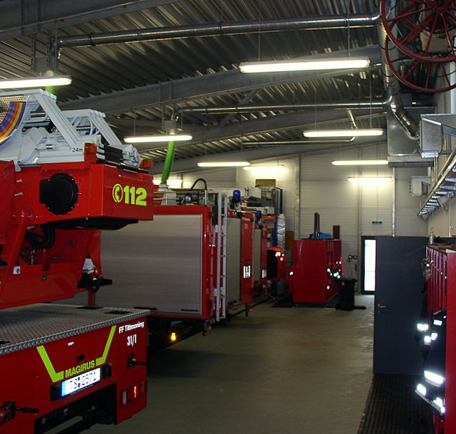 Das Herzstück besteht aus der Fahrzeughalle wo die Fahrzeuge untergestellt sind. Zudem ist hier die Atemschutzwerkstatt, Lager (allgemein), Schlauchlager mit Schaummittel und die moderne Schlauchpflegeeinrichtung untergebracht.
