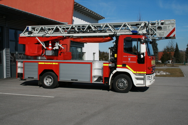 Die Drehleiter (DLK) ist das häufigste und bekannteste Hubrettungsfahrzeug der Feuerwehr. Die DLK 18 / 12 der Feuerwehr Tittmoning verfügt über einen Rettungskorb, der mit dem so gennanten Leiterpark fest montiert ist. Die Drehleiter hat eine Nennrettungshöhe von 18 Metern, das entspricht ungefähr der Höhe des 4. Obergeschosses.