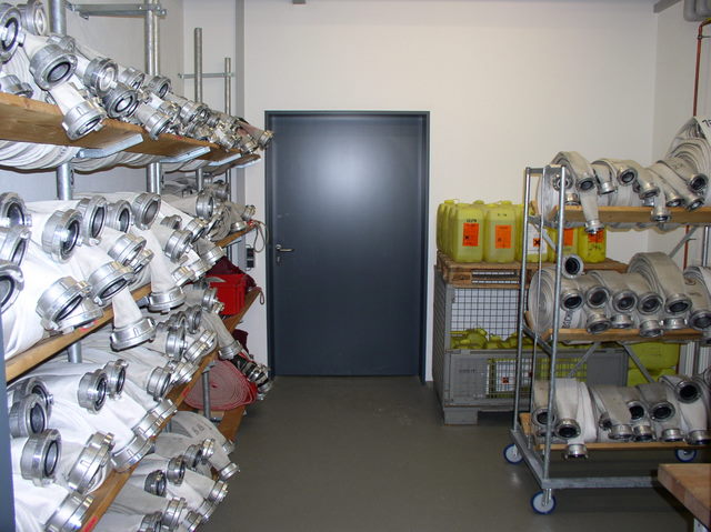 Das Herzstück besteht aus der Fahrzeughalle wo die Fahrzeuge untergestellt sind. Zudem ist hier die Atemschutzwerkstatt, Lager (allgemein), Schlauchlager mit Schaummittel und die moderne Schlauchpflegeeinrichtung untergebracht.